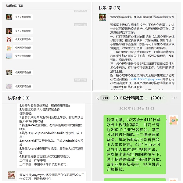 为了确保疫情防控期间毕业生顺利就业,学院及时发布网络招聘信息、短信咨询,掌握毕业生求职心态和就业进展,帮助学生解决就业过程中面临的困难和问题,切实服务好每一位毕业生,保证就业工作不断线。同时,毕业班辅导员和就业专员积极引导学生使用新形势下的招聘方式,动员学生参加伟德bv国际体育云就业视频双选会,助力毕业生顺利找到心仪的工作。除此之外,为保障广大在外实习生的身体健康和生命安全,该院要求毕业生暂停在外实习,推进网络办公。2016级软件工程6班的林桂涛同学说道:“个人感觉,疫情期间找工作最大的难点,就是面试方式的不同和个别岗位的缩减,但是并不用担心找不到工作。首先,国家颁布了一系列的就业政策,包括组织云招聘会等,大大提高了应届生的就业率;其次,面试大多采取线上视频面试,降低面试者的紧张感,各利于面试者的发挥。所以,无论有没有这次疫情,对于找工作,放平常心就好。”