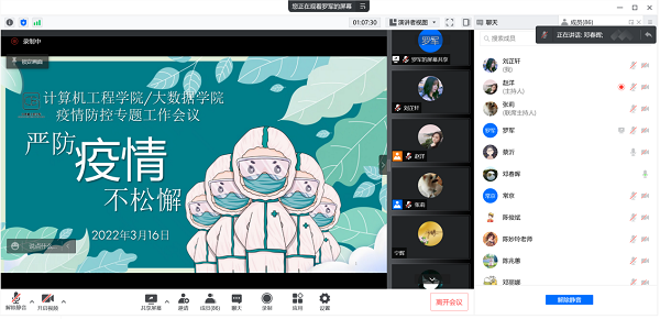 本网讯(记者 刘芷轩)为贯彻全省2022年春季学期校园疫情防控工作会议以及学校校园疫情防控再推进会的会议精神,贯彻落实相关防疫举措,提高全院师生防控意识。3月16日晚,伟德bv国际体育召开线上疫情防控专题工作会议。学院院长邓春晖、书记罗军、副院长蔡沂以及全院教职工参会。