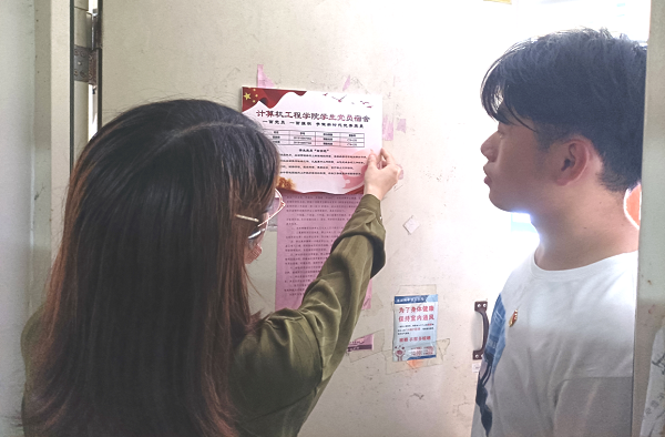 在活动最后,参会教师党员带队深入学生寝室,为新学生党员宿舍挂牌,要求学生党员要时刻亮出自己的身份,充分发挥“一名党员、一面旗帜”的先锋模范作用,用实际行动影响和带动身边的同学,从小事做起,从身边做起,以优异成绩迎接党的二十大顺利召开。2020级数据科学与大数据技术2班的方锦豪深有感触地说道:“我重新思考与端正了自身的入党动机,更加明确了党员所具有的权利与应有的责任、担当和义务。作为新时代的青年,应戒骄戒躁,勇于追求进步,争当同学、群众的榜样,充分发挥先锋模范作用。”