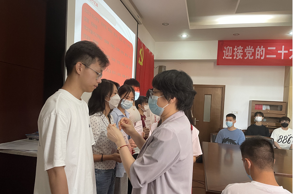 活动现场,罗军、党总支副书记罗婉玲、党总支宣传委员邓梦龄、青年委员潘田海分别为新发展党员庄重地佩戴党徽以及颁发“党员宿舍责任岗”。在罗军的领誓下,佩戴着党徽的31名新党员面向鲜红的党旗,举起右拳,许下了铮铮誓言。