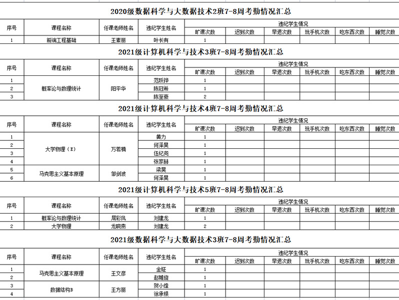 伟德bv国际体育/大数据学院2022-2023学年度第一学期7-8周学生考勤情况通报