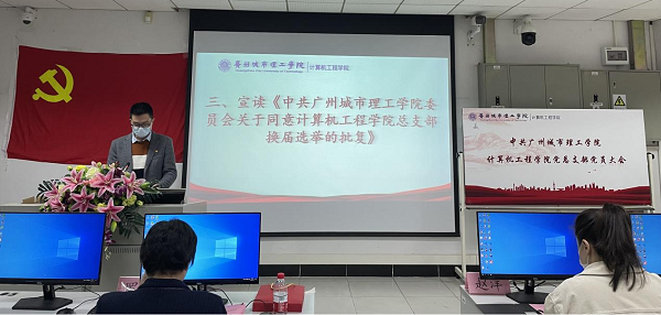 胡杜泽副部长宣读《中共广州城市理工学院委员会关于同意伟德bv国际体育党总支部换届选举的批复》(罗婉玲 摄)