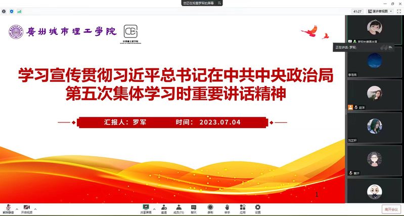会上,学院党总支书记罗军带领全院教职工以“第一议题”形式开展专题学习。全院教职工首先以视频形式认真学习“以中国式现代化全面推进中华民族伟大复兴的使命任务”,深刻领会中国式现代化的科学内涵、中国特色和本质要求。罗军指出,中国式现代化是中国共产党领导的社会主义现代化,党的领导确保中国式现代化锚定奋斗目标行稳致远,团结带领全国各族人民向着全面建成社会主义现代化强国、实现第二个百年奋斗目标进军,以中国式现代化全面推进中华民族伟大复兴。随后,她以“学习宣传贯彻习近平总书记在中共中央政治局第五次集体学习时重要讲话精神”为题开展领学,强调全体教职工必须深刻理解和把握习近平总书记重要讲话的丰富内涵、重大意义,在日常工作中通过加强组织领导、全面学习传达、加强宣传引导、深化研究阐释等途径,不断把学习贯彻习近平总书记系列重要讲话精神引向深入。最后,罗军带领全体教职工一起学习《广州城市理工学院章程》。