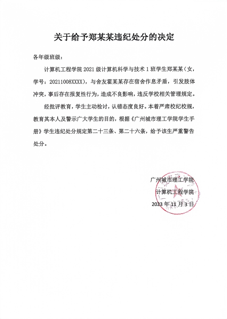 关于给予郑某某违纪处分的决定
