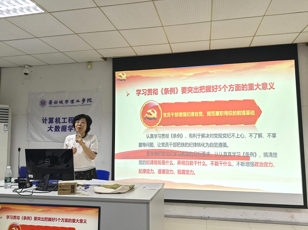 张彩霞结合学院工作实际,从新修订《中国共产党纪律处分条例》重要意义、主要内容和精髓要义等方面进行深入解读,并围绕学校系统中出现的违纪典型案例,对《条例》进行细致讲解,详细阐述学院实际工作当中存在的各风险点,教育引导全院党员要准确把握新修订条例的内涵要义和实践要求,树牢纪律观念、强化纪律敬畏、严格纪律约束,为全院党员上了一堂生动深刻的纪律教育课。她强调,要把认真学习贯彻《条例》作为当前和今后的一项重要政治任务,切实提高政治站位,并对全体党员提出了要求:一要带头做“两个维护”的践行者;二要带头做担当作为的“实干家”;三要做清正廉洁的“干净人”;四要做学习贯彻《条例》的“领头雁”。