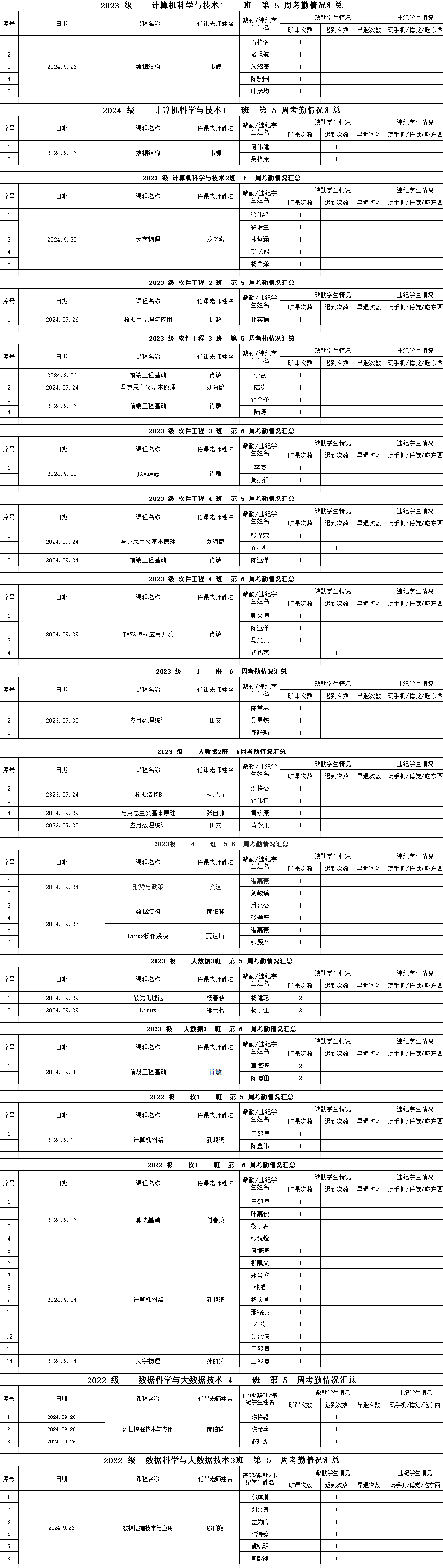 伟德bv国际体育/大数据学院2024-2025学年度第一学期第5-6周学生考勤情况通报