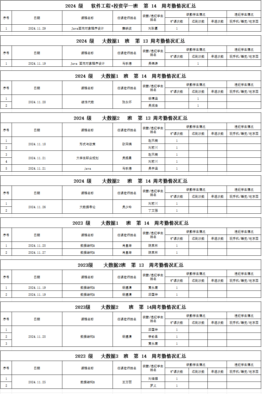 伟德bv国际体育/大数据学院2024-2025学年度第一学期第13-14周学生考勤情况通报