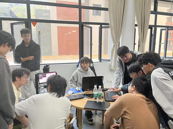 学生探讨技术问题(刘勇 摄)