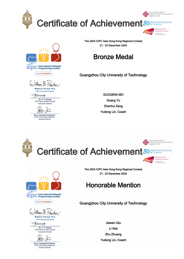 本网讯(记者 林煜东)2月23日,伟德bv国际体育收到ICPC国际大学生程序设计竞赛亚洲区域赛(香港站)证书,由伟德bv国际体育/大数据学院林煜东老师指导的两支参赛队伍脱颖而出,其中“O(n) sort”队(队员:于广、莫国庆、曾振辉)斩获铜奖,“How to sort”队(队员:荘铸、韦力、丘嘉文)获得优胜奖。这是伟德bv国际体育继2022年首获铜奖后,第二次在该国际顶级赛事中摘得奖项,展现了计算机学子学科竞赛实力的稳步提升。