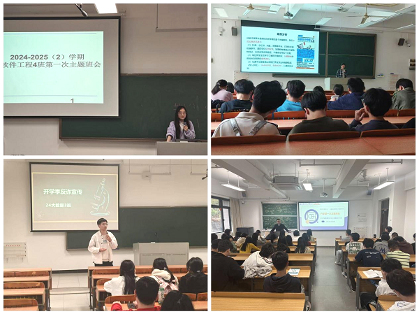 此次班会由各班班主任主持,主要围绕“开展理想信念教育、爱国主义教育等,引导学生们筑牢理想信念、涵养家国情怀、砥砺奋斗精神,努力成长为德智体美劳全面发展的高素质应用型人才;对班级上学期期末成绩进行总结,督促学生做好个人学业情况分析,合理规划新学期学习目标任务,教育引导学生严守课堂纪律,共创优良学风;组织学生学习法律法规知识和《高等学校学生行为准则》《学生手册》等制度规范,切实提升学生法治素养和规则意识;介绍校内外存在的各类安全隐患,开展意识形态、春季传染病防控、消防安全等教育活动,强化安全防范意识;对目前常见的网络刷单、网购退款、冒充公检法涉案等网络诈骗行为和学校近期发生的学生被诈骗案例进行分析,切实增强学生的防诈反诈意识和防范能力;开展新学期心理适应性调节,提醒学生面对新学期出现的心理困惑要及时和辅导员、班主任沟通,有需要的同学可寻求学校大学生心理健康教育与咨询中心帮助”六个方面开展。此外,针对2021级学生实习与就业情况,2021级班主任在班会上动员学生积极参加招聘活动,并提醒同学们在就业过程遇到困难可寻求辅导员和班主任帮助。