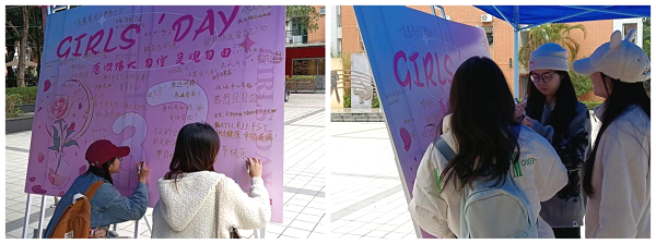 活动现场设置写祝福环节,女生们围聚在一起,或是独自沉思片刻,或是与同伴交流探讨后用彩色水笔在祝福板上写下对自己、对他人的祝福,有的祝福充满了对未来学业事业的期许,有的则满含对生活幸福的祈愿。这些祝福传递着女生们之间真挚的情感,同时路过的人都能感受到这份温暖与力量。