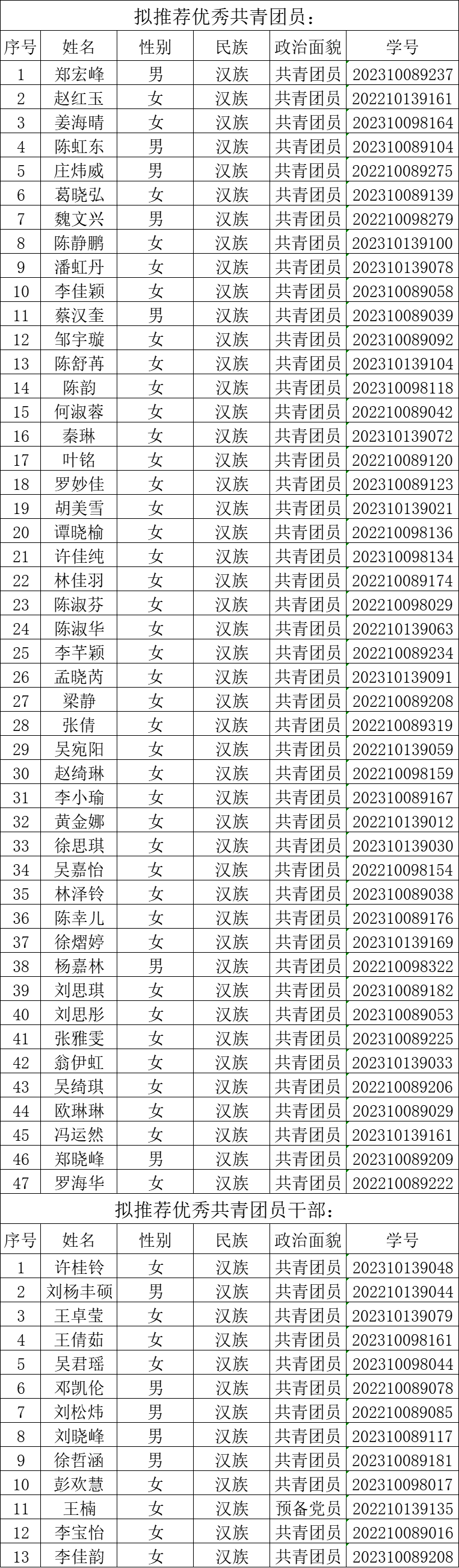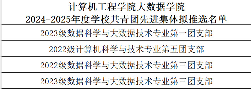 根据《关于开展2024—2025年度学校共青团先进集体和优秀个人评选工作的通知》的要求,由各团支部遴选推荐,经学院团委组织初步审查、学院党总支复查,拟推选2023级数据科学与大数据技术专业第一团支部等4个团支部,郑宏峰等47名团员及许桂铃等13名共青团员干部进行校级评审。现在将名单予以公示,名单如下: