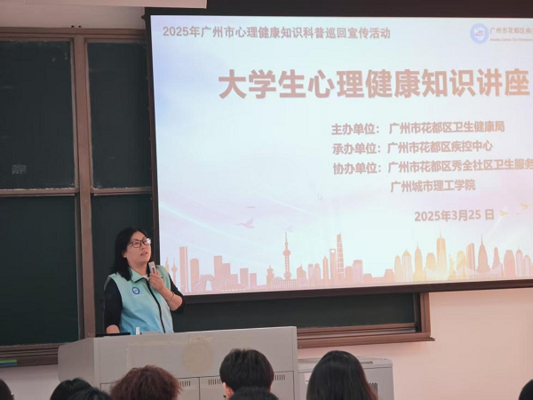 随后,广州市花都区疾控中心陈柔华医生围绕大学生常见的学业压力、人际交往、情绪管理、职业规划等心理问题展开讲解。通过生动的案例分析、互动问答和心理小测试等方式,剖析了心理问题、亚健康心理的成因及应对策略,并强调心理健康与身体健康同等重要的理念。