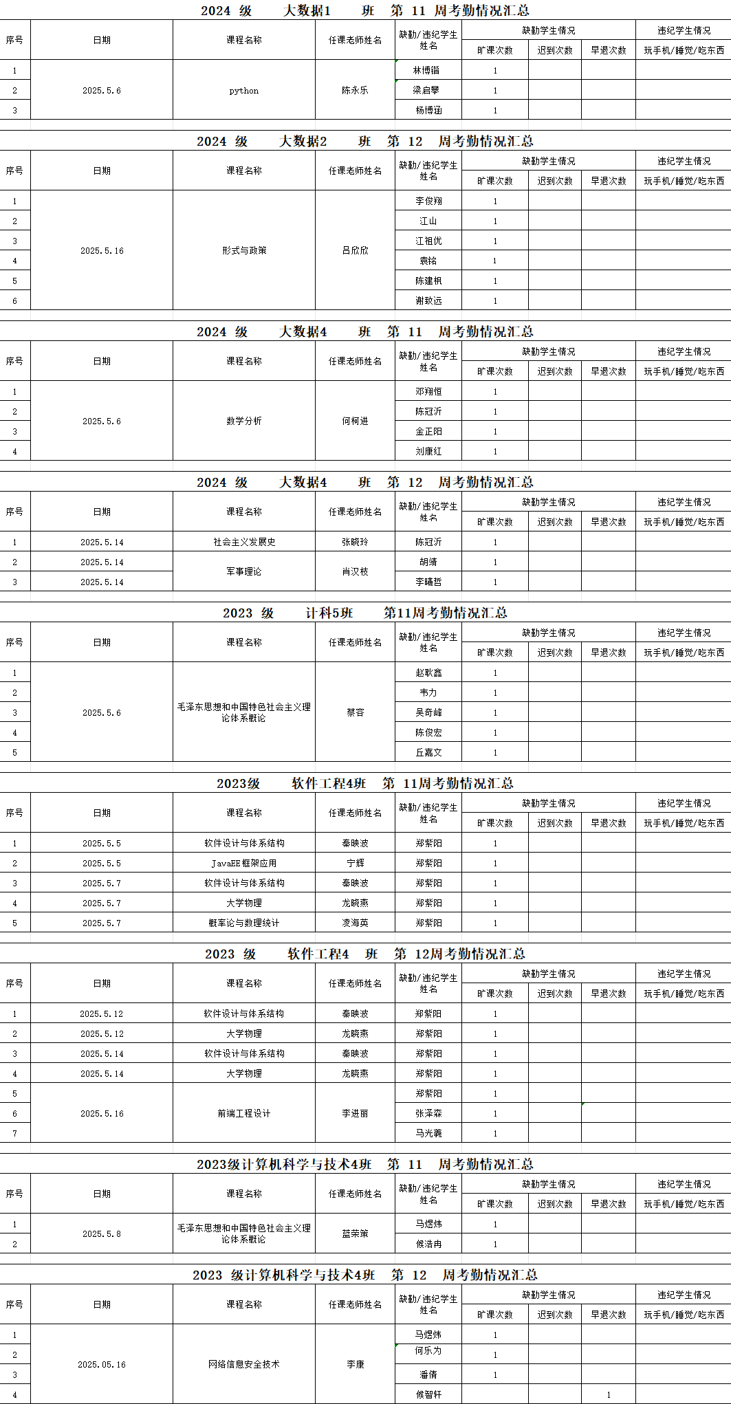 伟德bv国际体育/大数据学院2024-2025学年度第二学期第11-12周学生考勤情况通报