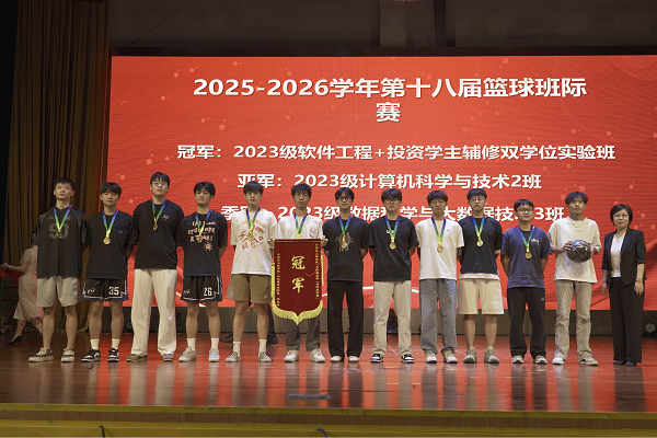 表彰环节,主持人先后宣布多项荣誉,包括“2025-2026学年度校级文明宿舍”C14栋107、108等26间宿舍,C21栋118、380等8间宿舍及C22栋124宿舍获此殊荣;付宇涵、官利娟等同学因“2025-2026学年图书馆借阅量前十”受表彰;“第十八届篮球班际赛”中,2023级软件工程+投资学主辅修双学位实验班获冠军,2023级计算机科学与技术2班获亚军,2023级数据科学与大数据技术3班获季军。