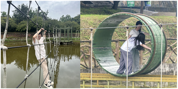 活动以“重走长征路”情景模拟拉开序幕。首项“水上闯关”迅速点燃团队热情。学生干部通过浮桥、攀爬网等障碍时需合作解答党史问题,既考验体力又检验知识储备。在“飞夺泸定桥”模拟项目中,学生干部需要使用有限的木板,完成桥梁的搭建。大家商讨策略,分组拿取木板,调整木板的位置和角度,确保桥梁稳固,最终实现全员安全通行。学生会主席团成员陈杨柳表示:“这些项目让我们真切体会到革命先辈的智慧与勇气。”