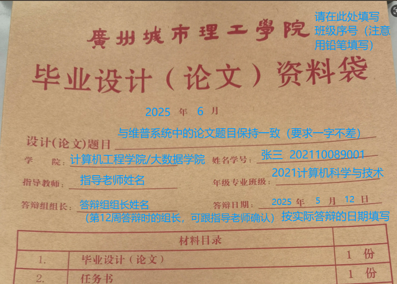 毕业设计资料袋封面内容最好先用铅笔填写,交给指导老师确认无误后,再用黑色签字笔描写;资料袋不允许涂改,每位同学只此一份。