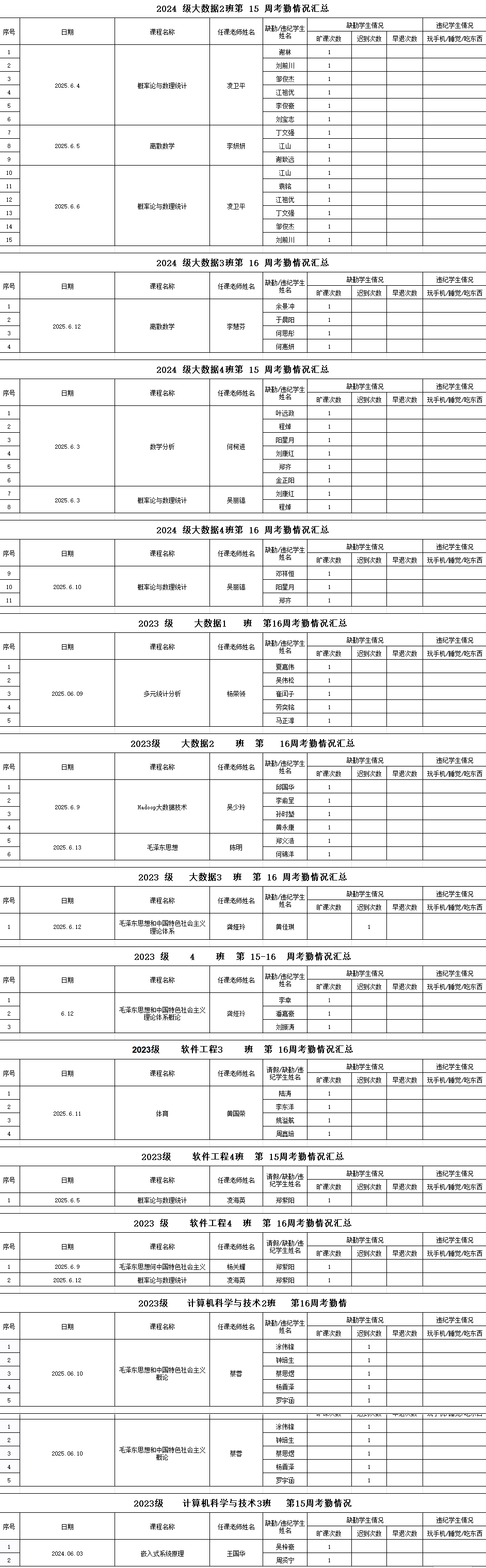 伟德bv国际体育/大数据学院2024-2025学年度第二学期第15-16周学生考勤情况通报