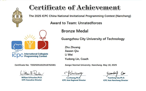 本网讯(记者 陈雪松)5月25日,伟德bv国际体育收到2025年ICPC国际大学生程序设计竞赛全国邀请赛(南昌)证书,来自伟德bv国际体育/大数据学院2023级ACM特色实验班的学生荘铸、丘嘉文、韦力,在比赛中表现出色,获得铜奖。