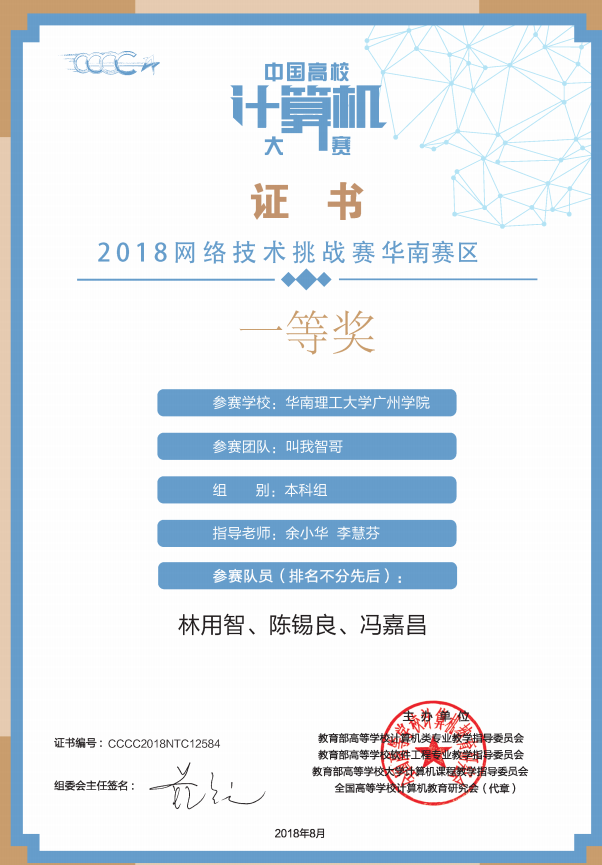 图6 2018年网络技术挑战赛华南赛区1等奖