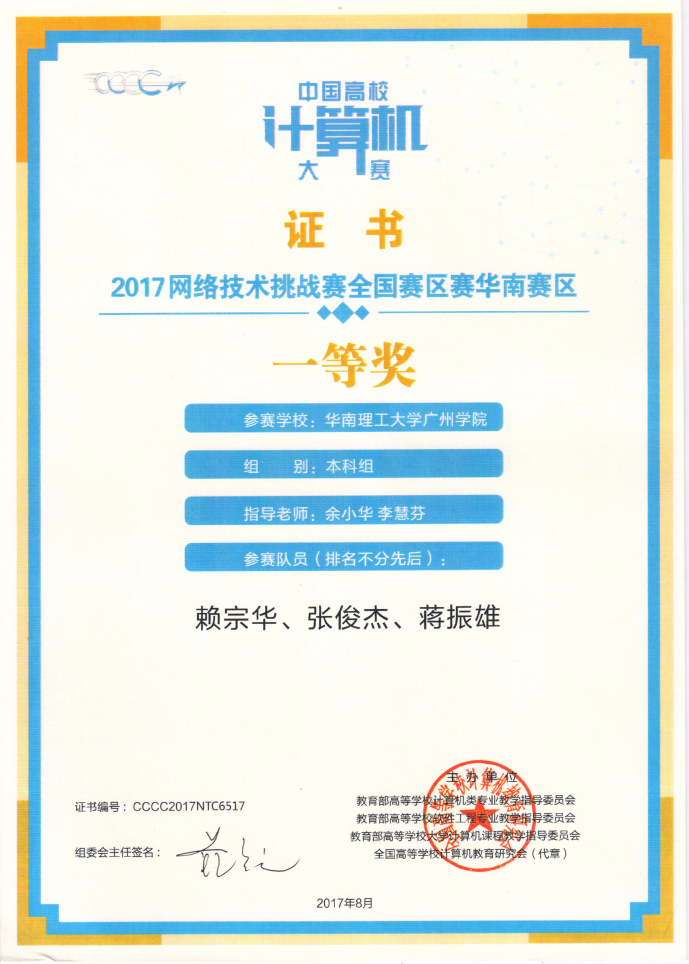 图5 2017年网络技术挑战赛全国赛区华南赛区1等奖