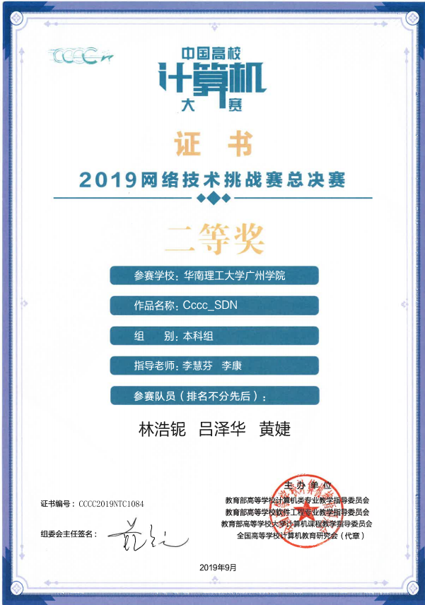 图7 2019年网络技术挑战赛全国总决赛2等奖